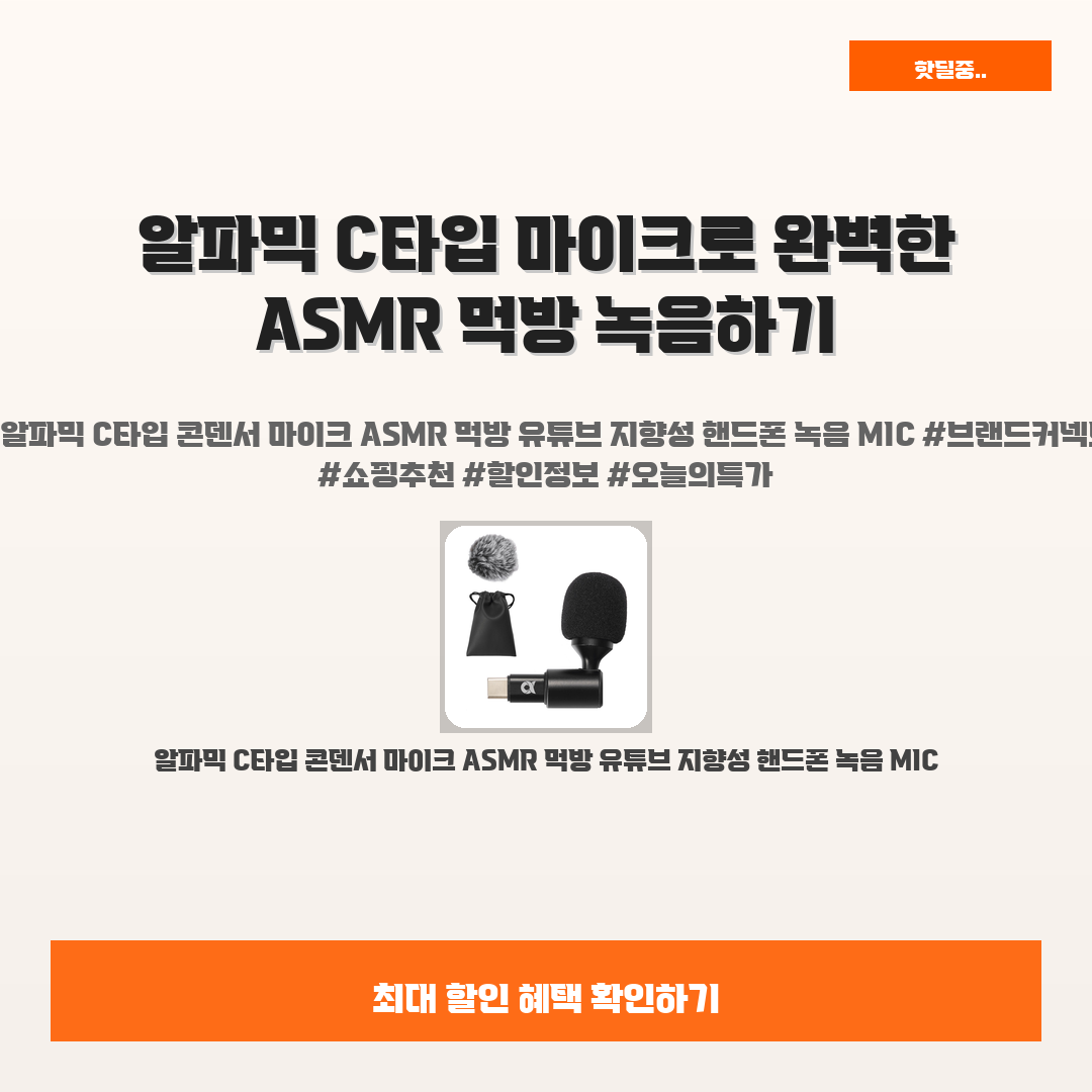 🛍️ 이 포스팅은 네이버 쇼핑 커넥트 활동의 일환으로,판매 발생 시 수수료를 제공받습니다.오늘 소개할 제품은 단연코,,바로 알파믹 C타입 콘덴서 마이크 ASMR 먹방 유튜브 지향성 핸드폰 녹음 MIC입니다!요즘 ASMR 먹방 영상에 빠져 있는 당신, 혹시 소리 녹음이 잘 안 되거나 원하는 풍경을 담지 못해 고민하고 있진 않나요?[상품명]을 사용하면 그 고민을 완벽하게 해결할 수 있어요.친구들에게 보여줄 먹방 영상, 이제 생생한 소리로 감동을 전하세요!이 마이크 하나면 어느 장소에서나 고품질로 소리를 잡을 수 있어 진짜 놀랍답니다.진짜 사도 후회 없는 제품이라고 약속할게요. 주변에 추천만 해도 귀엽고 이득이에요!그리고 현재 할인된 가격으로 만나볼 수 있으니, 이 기회를 절대 놓치지 마세요!※ 이거 진짜 ..